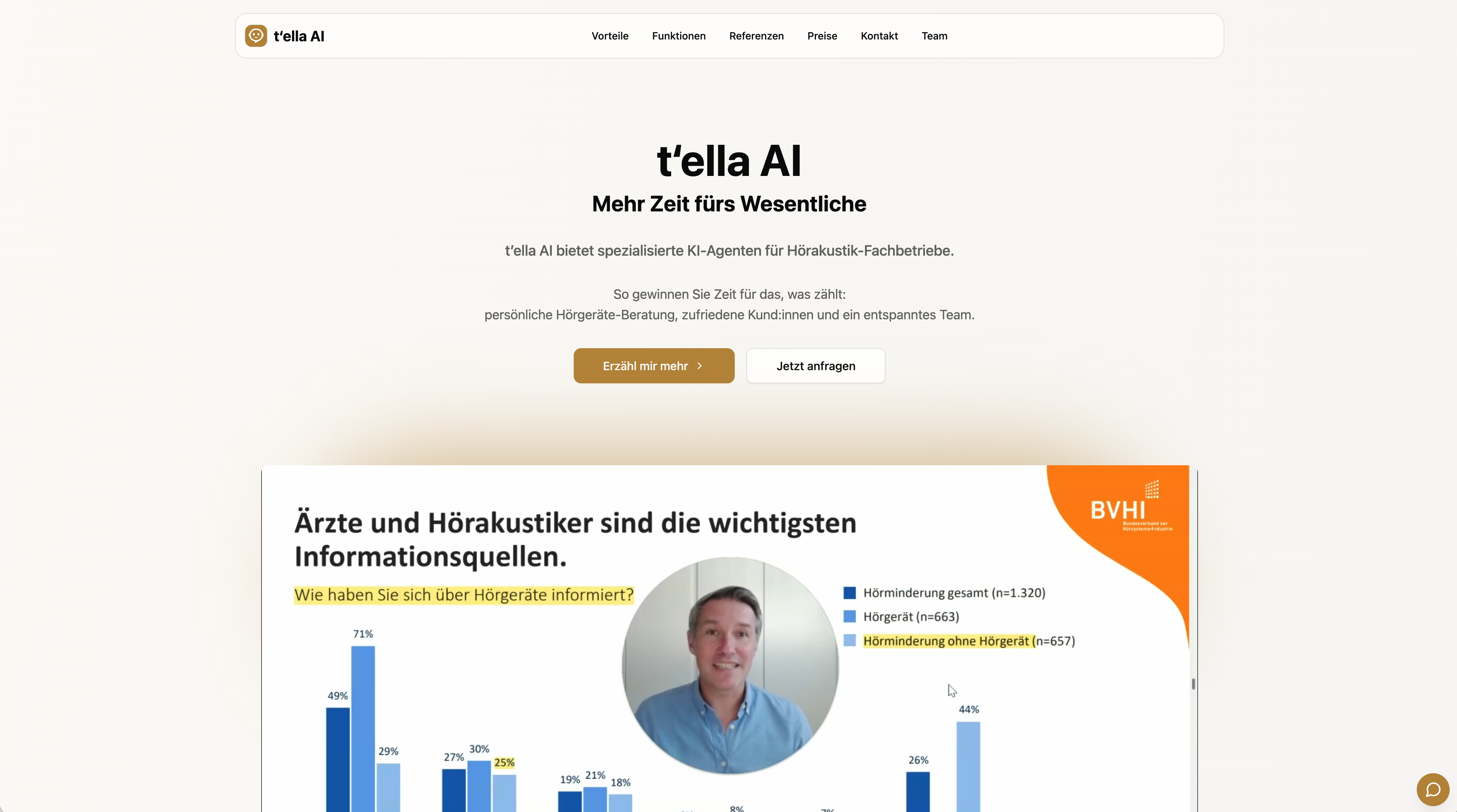 Für t‘ella AI durfte ich eine Landingpage entwickeln. Die Herausforderung lag darin potentielle Kunden in der Hörakustikbranche innerhalb von Sekunden von den Vorteilen und Funktionen des KI Agenten zu überzeugen.